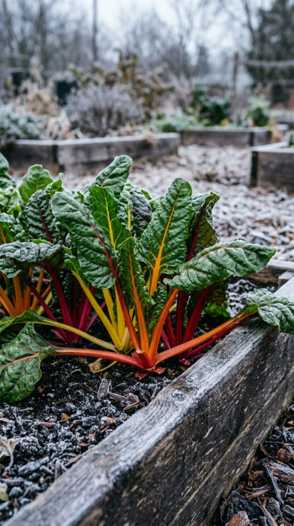 Swiss chard brings a splash of pure color to the winter vegetable garden that no other crop quite matches. Those blazing red, yellow, and orange stems are like stained glass in a grey winter landscape — genuinely stunning.