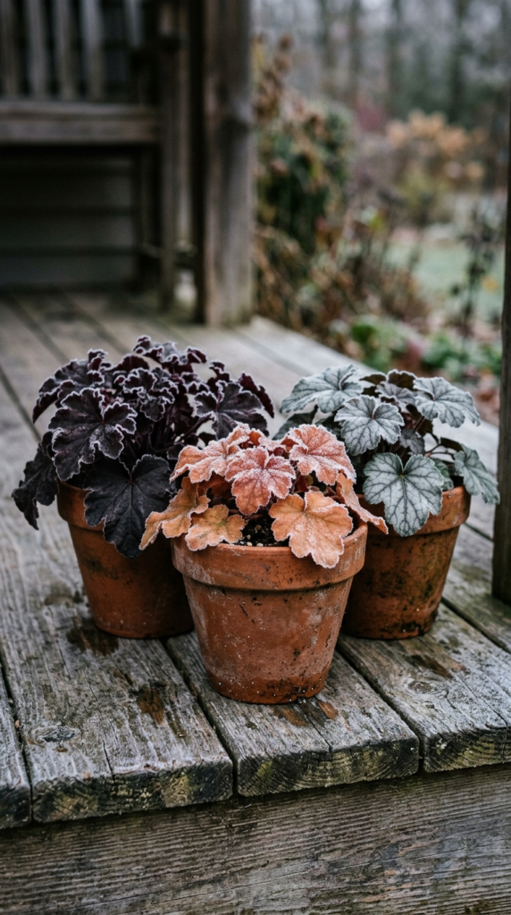 They’re relatively compact, which makes them ideal for smaller pots or as the filler layer in a larger mixed container. Pair dark burgundy heucheras with silvery dusty miller and trailing green ivy for a winter pot combination that looks genuinely professional.