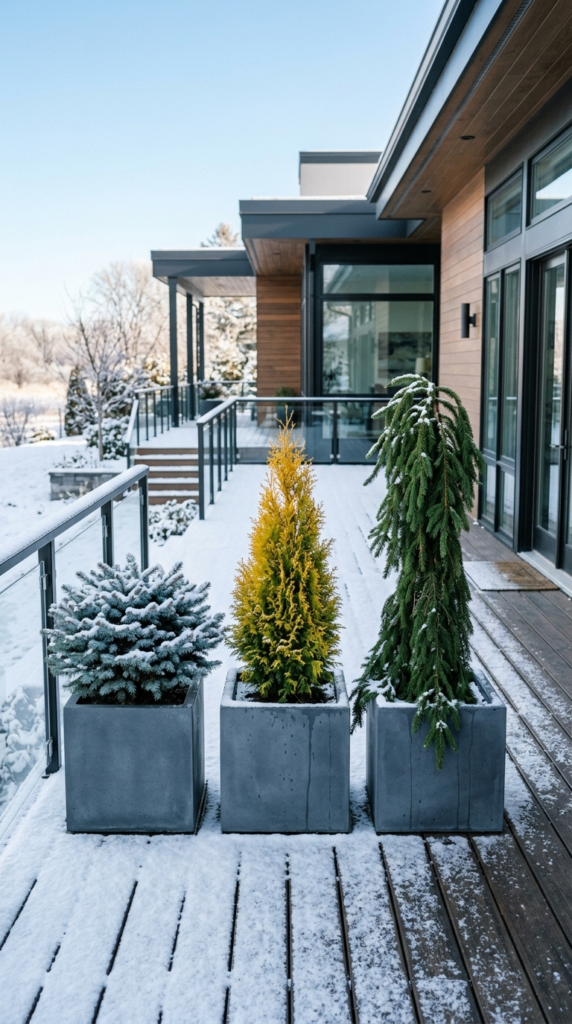 The secret is variety: Mix a globe form, a columnar form, and a weeping form for incredible visual interest. Add color variation — blue spruces, golden arborvitaes, and green junipers together in a grouping create a winter scene that looks like it came straight out of a design magazine.