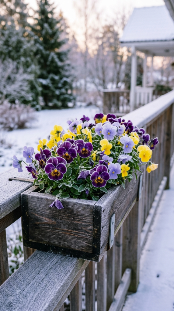 Plant them densely in containers for the fullest effect — a pot absolutely packed with violas in a rich jewel-tone mix of purples, yellows, and whites looks absolutely incredible against bare winter branches or a snowy backdrop.