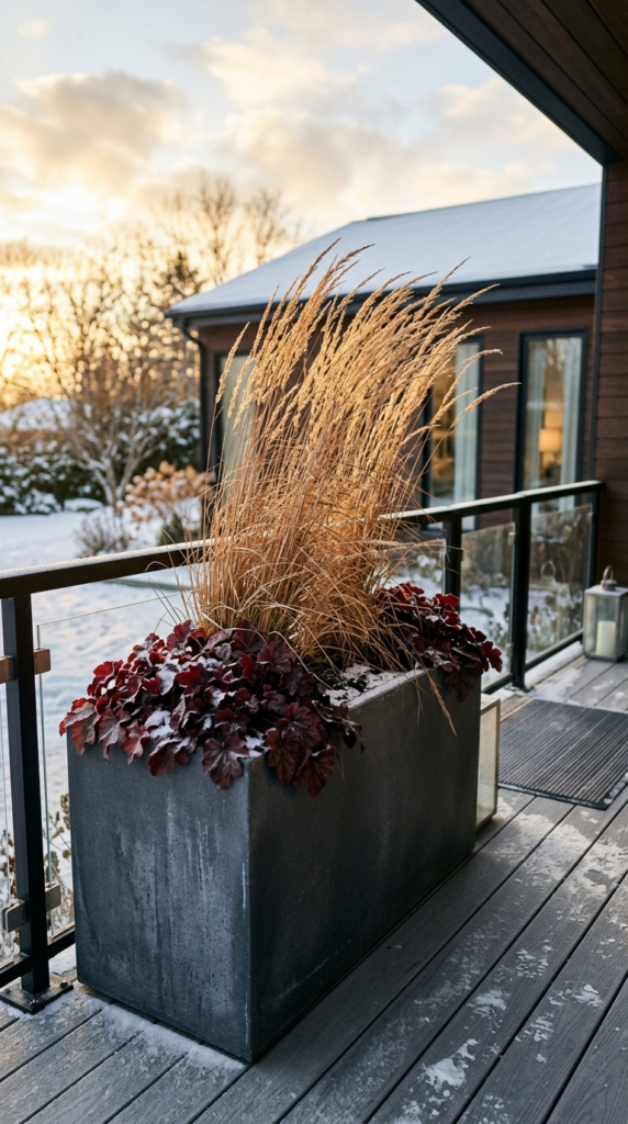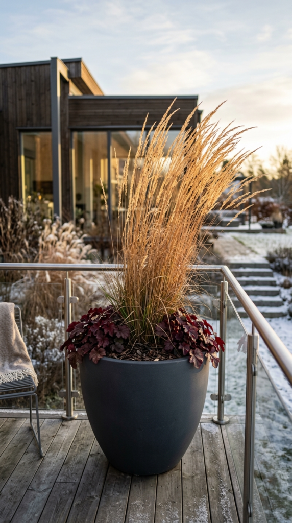 Ornamental grasses bring movement, texture, and drama to winter containers that no other plant can replicate — their rustling seed heads and tawny, golden winter foliage catch every bit of low winter light and look spectacular even in the bleakest weather.