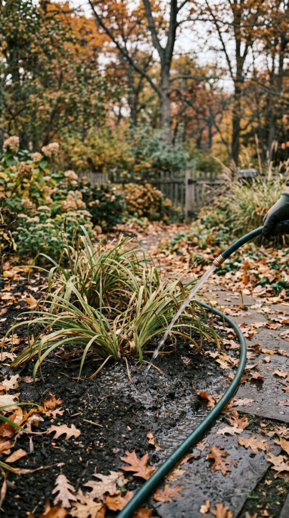 Before the ground freezes solid, give your daylilies a thorough, deep soaking — enough to penetrate 8–10 inches into the soil. This charges the root zone with moisture that will carry the plant through the dormant season.