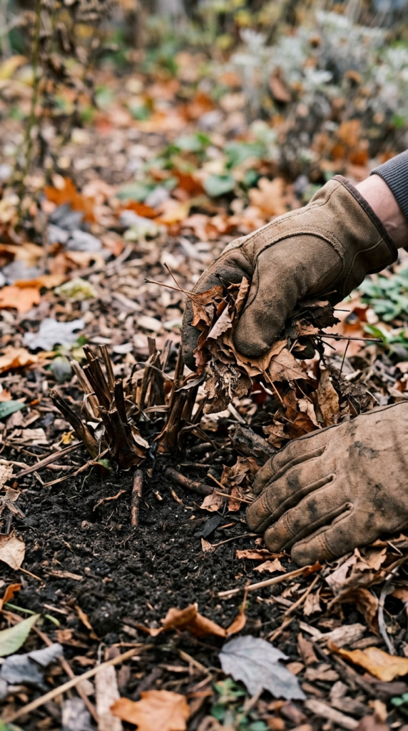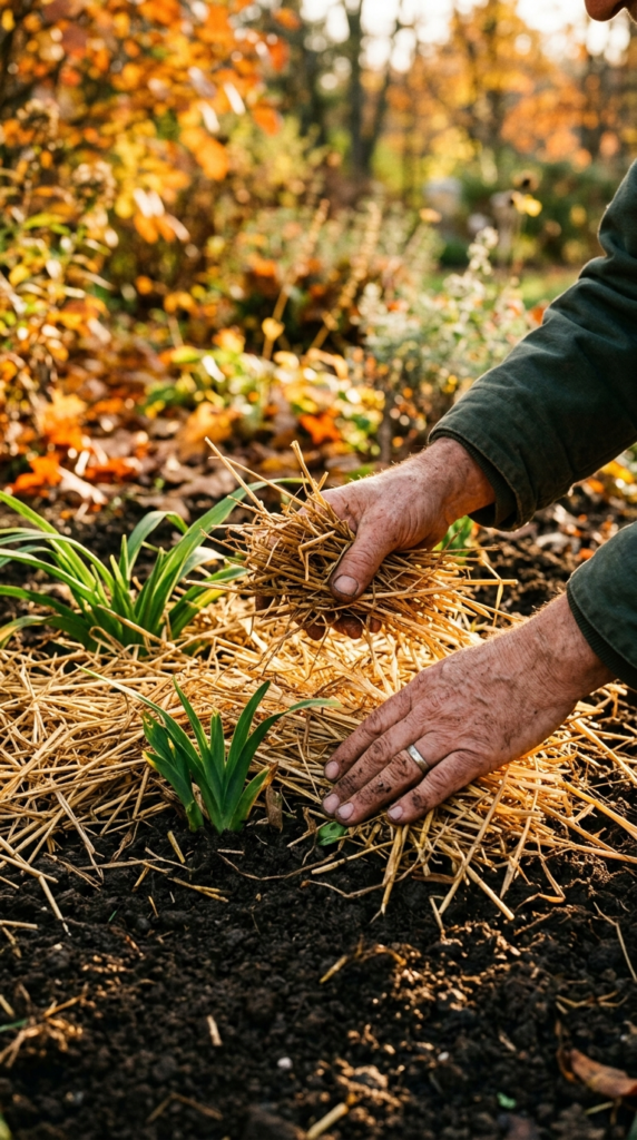 Wait until after the first hard frost and the soil has started to cool before applying mulch. If you mulch too early, you can actually trap warmth and encourage the plant to keep growing when it should be going dormant.