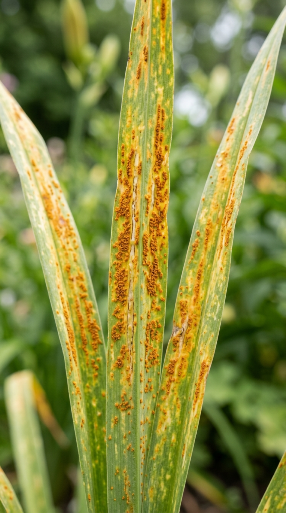 Daylily rust (caused by the fungus Phakopsora hemerocallidis) shows up as yellow streaks on leaves with rusty orange pustules underneath. If you saw this, remove and bag all affected foliage, then treat the crown area with a copper-based fungicide.