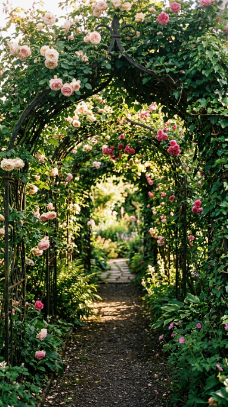 • Wisteria creates the most dramatic flowering tunnel but needs 3–5 years to establish