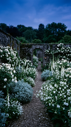 The planting palette is everything here: white roses (Rosa ‘Iceberg’ or ‘Climbing Snowflake’), white Foxgloves, Nicotiana sylvestris for that intoxicating night fragrance, silvery Stachys byzantina, Artemisia ‘Powis Castle’, and white-flowered Clematis climbing the walls. Layer heights from tall climbers down to ground-hugging silver Lamb’s Ears.