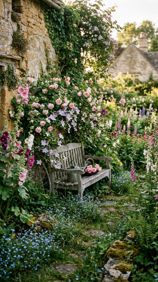The secret is layering plants that self-seed and spread — Foxgloves, Aquilegia, Forget-me-nots, and Welsh Poppies will colonize every gap and crack in your hidden nook, filling it with that beautiful soft randomness that makes cottage gardens feel like they happened organically over decades rather than being planted last spring.