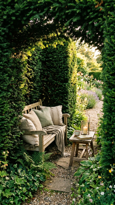 The interior of your hedge nook deserves the same care as any interior room — a beautiful bench, outdoor cushions in weather-resistant fabric, a small side table, storm lanterns for evening use, and perhaps a small planted container inside the space for a living focal point.