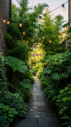 Overhead festoon lights strung from wall to wall at height transform the evening side return into something genuinely cinematic — the warm amber bulbs glowing through an overhead canopy of leaves is one of the most beautiful small-garden moments you can create.