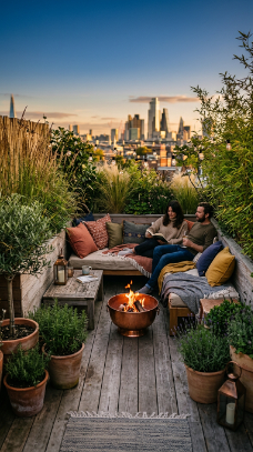 Once your screening is established, furnish the inner space as you would any outdoor room — a low daybed, scatter cushions in outdoor fabric, a small fire pit or chiminea, and good lighting for evening use. The contrast between the intimate, furnished inner space and the hidden urban world just beyond the planted screens is genuinely thrilling.