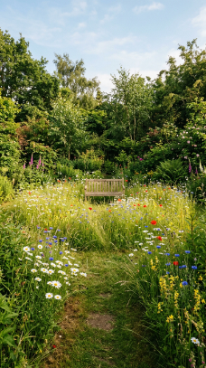 The secret is the contrast between the path in and the clearing itself — the approach through tall, dense planting (even just overgrown borders or a grass path cut through long grass) makes the emergence into an open, sun-filled wildflower clearing feel genuinely dramatic and surprising.