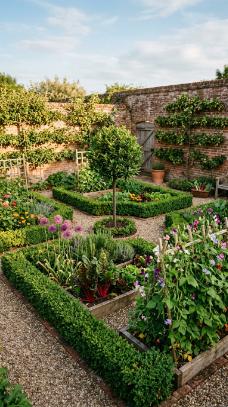 💡 Pro Tip: Include at least one standard trained tree at the center of your potager — a standard gooseberry, bay tree, or rose trained as a lollipop gives height, a clear focal point, and a vertical element that anchors the whole design. Without a centerpiece, even a beautifully planted potager can feel flat and directionless.
