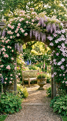 Climbing roses combined with Clematis are the classic living arch combination because they extend the flowering season — early Clematis (Group 1) flowers in spring before the roses peak, the roses take over in early summer, and late-flowering Clematis (Group 3) continue right through to autumn. One arch, three seasons of extraordinary bloom.