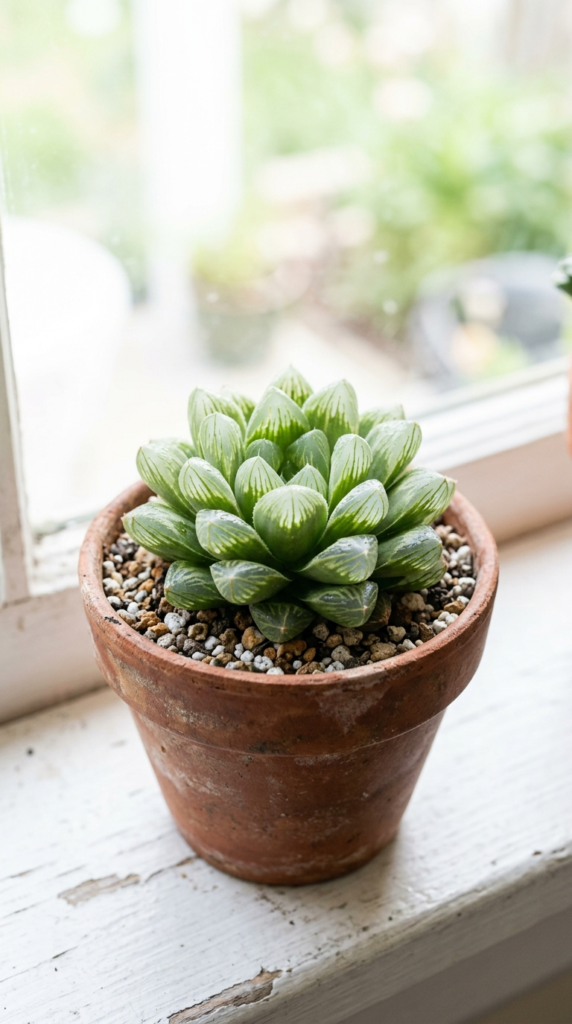 Haworthias are one of the few succulents that genuinely prefer low indirect light, so they’re perfect for spots away from the window where most succulents would struggle.