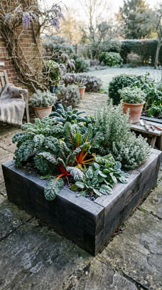 The visual impact of a well-planted raised bed in winter is genuinely striking — the deep green and vivid colored foliage of winter vegetables against dark-stained timber, on a frost-touched patio, is exactly the kind of image that makes people stop scrolling on Instagram. Productive gardens are beautiful gardens!