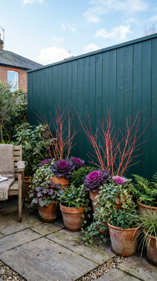 Deep, saturated colors work magnificently in winter gardens — forest green, deep teal, charcoal grey, navy blue, and inky black all create extraordinary backdrops for winter planting. These dark, rich tones make frost-kissed foliage pop, make warm lighting glow more intensely, and give small outdoor spaces a sophisticated, gallery-like quality.