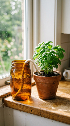 Thread one end of a thick cotton wick into the soil and submerge the other end in a water-filled container. Capillary action does the rest — water slowly travels up into the soil, keeping it consistently moist for up to a week.
