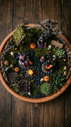 Use a shallow dish or wooden tray as your base. Arrange succulent rosettes alongside tiny witch figurines, miniature pumpkins, and spiderweb accents. Add black pebbles and dark moss for that perfect witch’s garden vibe.