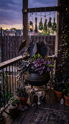 13. Add a Witch’s Garden Corner With Dark Foliage and Seasonal Decor