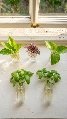Snip a 4–6 inch cutting just below a leaf node from healthy plants like pothos, tradescantia, basil, succulents, or begonias. Pop it in a glass of water or moist perlite and put it in a bright spot. In 2–3 weeks: new roots, new plant, zero cost.
