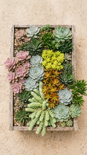 Build a shallow trough (6 inches deep is plenty for succulent roots) from cedar planks and fill with a gritty succulent mix: 50% quality potting mix and 50% horticultural grit or perlite for the sharp drainage succulents demand. Plant in deliberate blocks — a section of dusty rose echeveria, a sweep of silver sedum, a row of deep green haworthia — for a color-block pattern that reads beautifully from street level.