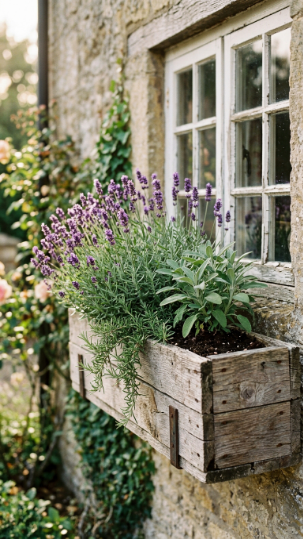 Plant with herbs that complement the rustic aesthetic — lavender, sage, trailing rosemary, and thyme — for a farmhouse herb window box that looks genuinely artisan and smells absolutely incredible every time you open the window above it.