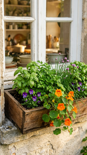 Here’s the thing: a window box directly outside your kitchen window that you can harvest through an open sash is one of the most genuinely useful and deeply satisfying garden setups imaginable. Fresh basil, chives, parsley, and edible nasturtiums — all within arm’s reach while you’re cooking. It’s the ultimate edible window box kitchen garden.