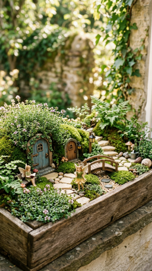 A fairy garden window box is the creative window box idea that stops absolutely everyone in their tracks — children and adults equally. A wide, shallow box planted with creeping thyme, cushion moss, and baby succulents, then populated with a complete miniature world of tiny doors, stone pathways, wooden bridges, and fairy figurines becomes living, breathing storytelling that makes your home’s exterior genuinely magical.