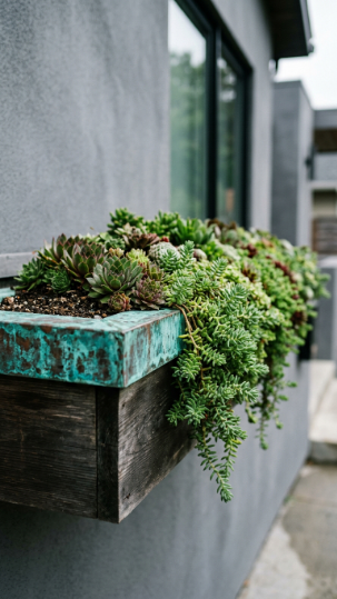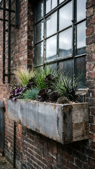 For the industrial-aesthetic home — exposed brick, steel-framed windows, warehouse conversions — a window box that combines reclaimed wood with folded raw steel panels creates a genuinely architectural exterior feature that complements the building rather than softening it into cottage-garden territory.