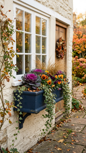Here’s the thing: a Halloween-themed window box that uses real plants as the foundation of the display is infinitely more striking than one built purely from artificial decorations — the living plants give the whole arrangement genuine presence and weight that plastic props simply can’t replicate.