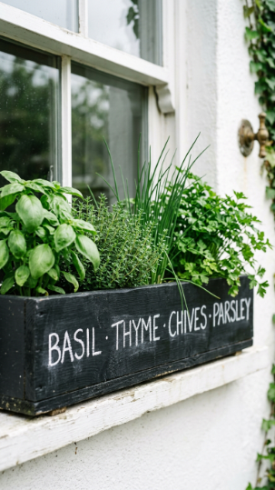 The chalkboard-painted herb window box is brilliantly clever — the entire outer face of the box is painted in exterior chalkboard paint, and you write the name of each herb directly on the front of the box in white chalk exactly below where it grows. The labeling is part of the design, and it’s infinitely updatable as you swap plants through the season.