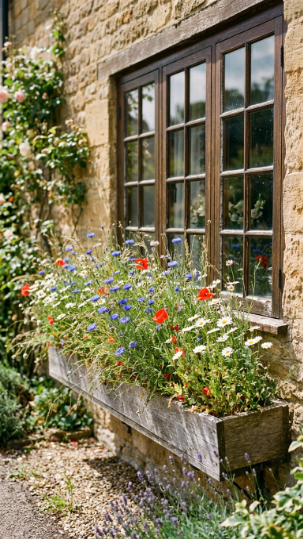 A wildflower meadow window box is the most naturalistic and ecologically generous creative window box idea on this list — and the most beautifully effortless-looking, despite being one of the easiest to plant. Scatter a native wildflower seed mix into a deep, lean-soiled box (wildflowers actually prefer poorer soils — too rich and you get all leaves, no flowers), water it in, and then largely leave it alone.