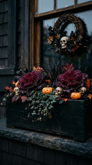Paint a window box in matte black exterior paint, plant with deep burgundy ornamental kale, trailing dark ivy, and black mondo grass, then dress with tiny carved mini pumpkins, small skull ornaments, preserved dark autumn leaves, and lengths of artificial spider web draped along the front edge.