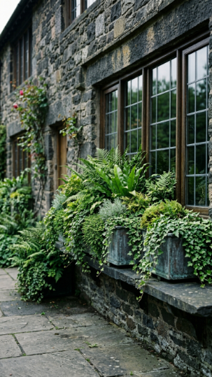 The all-green foliage window box is a design choice that communicates extraordinary confidence — using no flowers at all, relying entirely on the extraordinary variety of greens, textures, and leaf forms available in foliage plants to create a display of genuine sophistication.