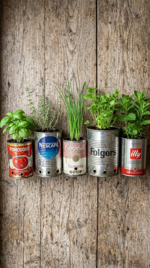 1. Upcycled Tin Can Herb Garden with Drainage Holes