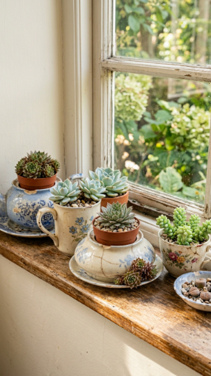 3. Peat-Free Succulent Windowsill Display in Reclaimed Crockery