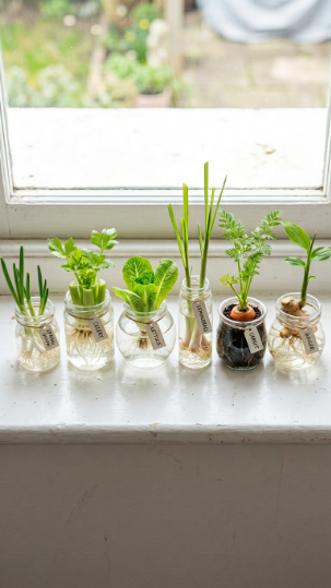 The easiest possible starting point today is the kitchen scrap regrowth station (section 4). Take the root end of a spring onion from your next meal preparation, place it in a small glass jar with 1cm of water, and set it on your brightest windowsill. New green shoots will emerge within 3–5 days — a genuinely visible result before the end of the week, with zero cost and zero materials required beyond what you already own.