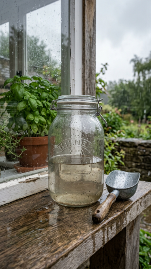 🖼️ IMAGE PROMPT: A realistic close-up photograph of a large repurposed glass kilner jar positioned on an outside windowsill ledge in light rain, collecting rainwater, with a small watering scoop beside it and a potted herb visible in the window behind. Lighting: soft overcast grey natural light. Color palette: clear glass, steel-grey sky, green herb, rain droplets. Mood: practical, ecological, calm. Photography