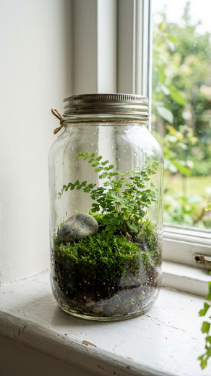 A glass jar terrarium is the closest thing to a self-sustaining windowsill ecosystem that requires almost nothing from you once established.