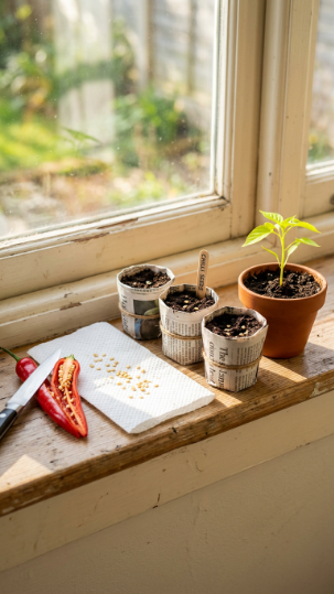 Saving seeds from a single supermarket chilli and resowing them on your windowsill is one of the most satisfying eco friendly DIY windowsill project ideas — producing 20–30 seeds from a pepper that cost less than 50p, entirely for free.