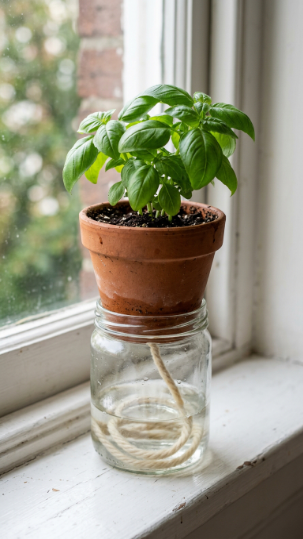 The wool draws water upward continuously as the compost dries, maintaining consistent moisture at root level without any overwatering risk — the plant draws only what it needs. This system is particularly effective for basil, which suffers from both drought stress and overwatering and benefits enormously from consistent moisture without waterlogging.