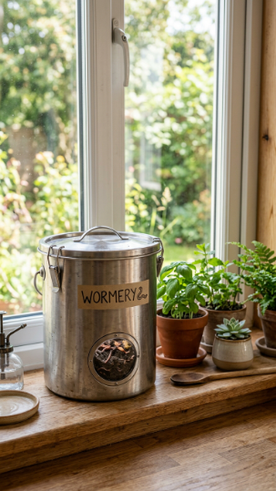 A miniature windowsill wormery in a repurposed metal bin converts a handful of kitchen scraps each day into the richest possible plant food, without the smell, space requirement, or complexity of a full outdoor compost system.