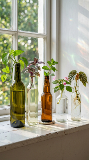Collect glass bottles in varying heights and colours: wine bottles (deep green, elegant), olive oil bottles (tall and clear), amber beer bottles (warm toned), and sauce bottles (shorter, for smaller cuttings). Clean thoroughly and remove labels by soaking in hot water with a splash of white vinegar for 30 minutes. The glass colour affects the growing environment: green and amber glass reduces light penetration to the water, which slows algae growth — one of the most practical reasons to use coloured glass over clear.