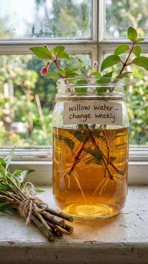 Willow water — made by steeping fresh willow stems in water — contains natural indolebutyric acid (IBA) and salicylic acid, the same rooting hormones found in commercial rooting powder but entirely free, organic, and self-made from foraged material.