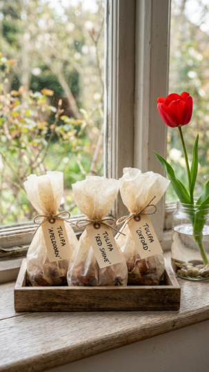 Tulips (Tulipa), hyacinths, and muscari all require 8–12 weeks at 5–7°C to break dormancy before they will bloom indoors. The standard method uses plastic zip-lock bags filled with slightly damp compost. The eco alternative: cut wax paper (baking parchment is fully compostable) into 30cm × 30cm squares, fill the centre with a handful of barely damp peat-free compost, place the bulb in the compost, and twist the paper into a parcel secured with a biodegradable paper tie or a strip of torn fabric.