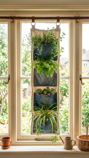 A fabric pocket garden in front of your window makes the most of every inch of light while giving discarded textile a genuinely purposeful second life.