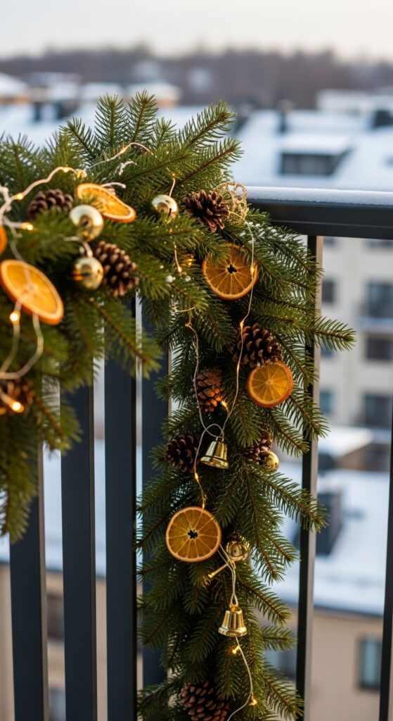 Your balcony railing is prime decorating real estate and most people completely ignore it in winter! Draping a lush evergreen garland along the top rail is one of the simplest, most dramatic upgrades you can make.