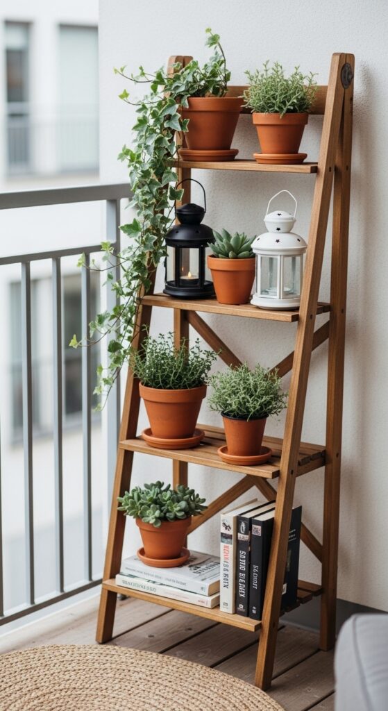 If you’re working with a small balcony, going vertical is your best friend. A slim plant ladder or tiered outdoor shelf lets you display plants, lanterns, books, and decor without eating up your precious floor space — and it looks absolutely charming!