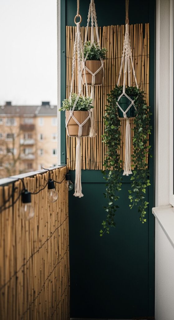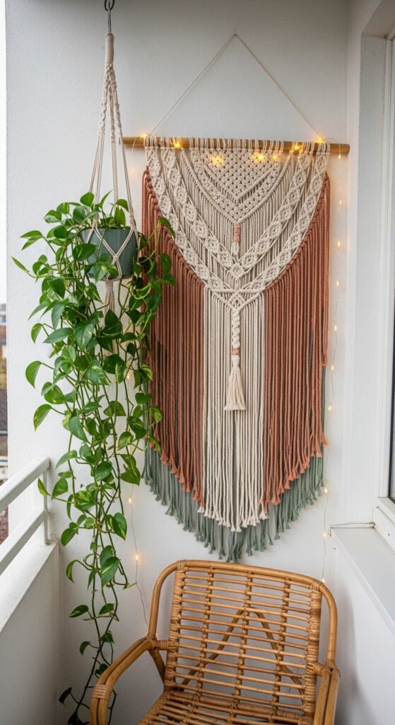 Macramé wall hangings are perfect because they’re lightweight, weather-tolerant, and add incredible texture. A large piece on your main wall creates an instant focal point that anchors the whole space. Pair it with a hanging planter on one side and a small wall-mounted lantern on the other for a fully styled wall vignette.