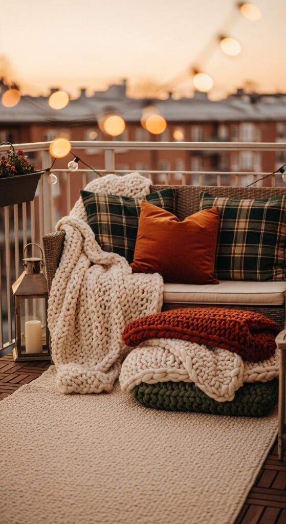 - Layering outdoor rugs, throw blankets, and weather-resistant cushions is the fastest way to make your balcony feel warm and inviting in winter.
